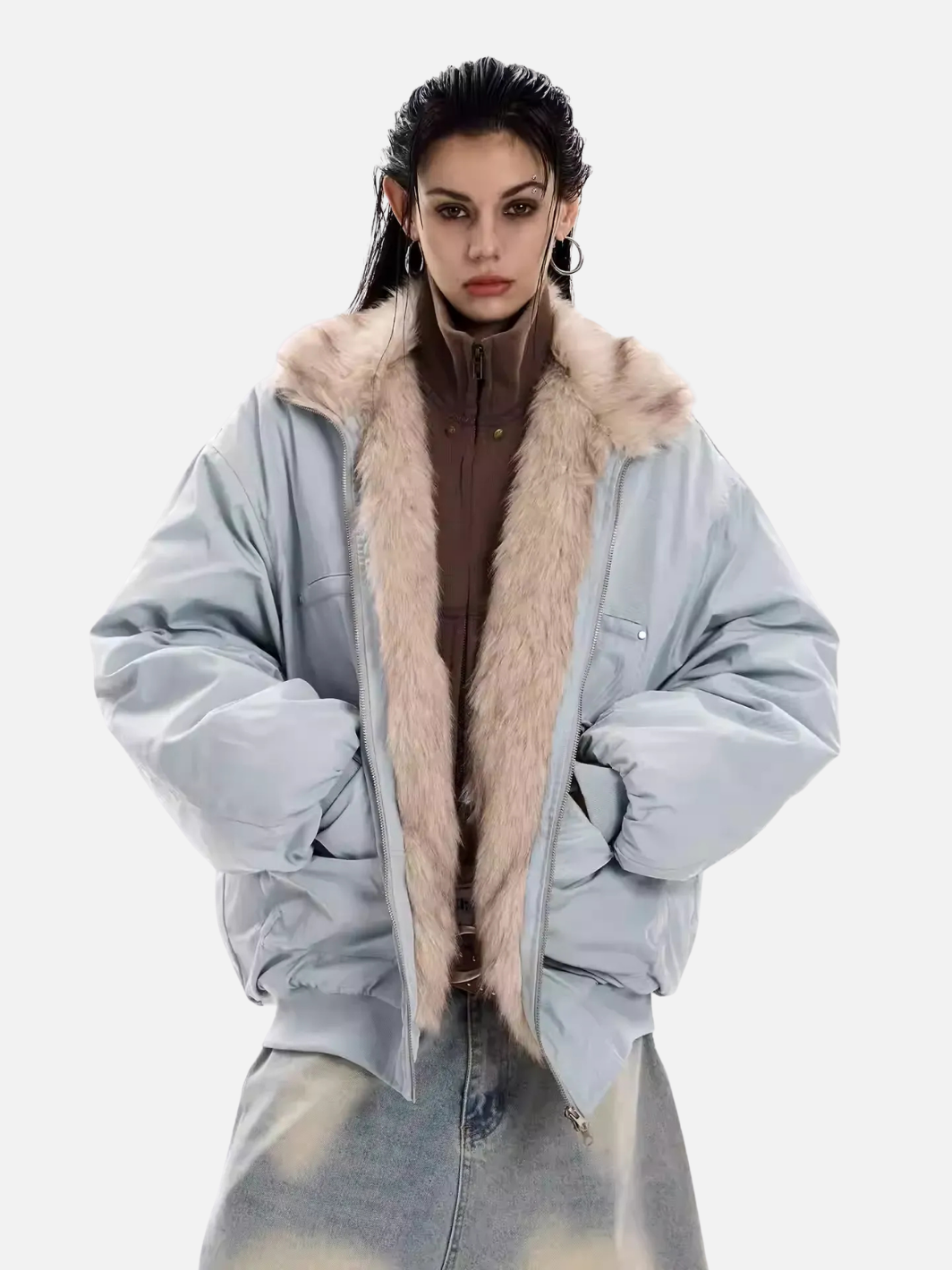 Cold air, steady pulse. Suede-textured grey meets soft fur accents in a bomber cut that...