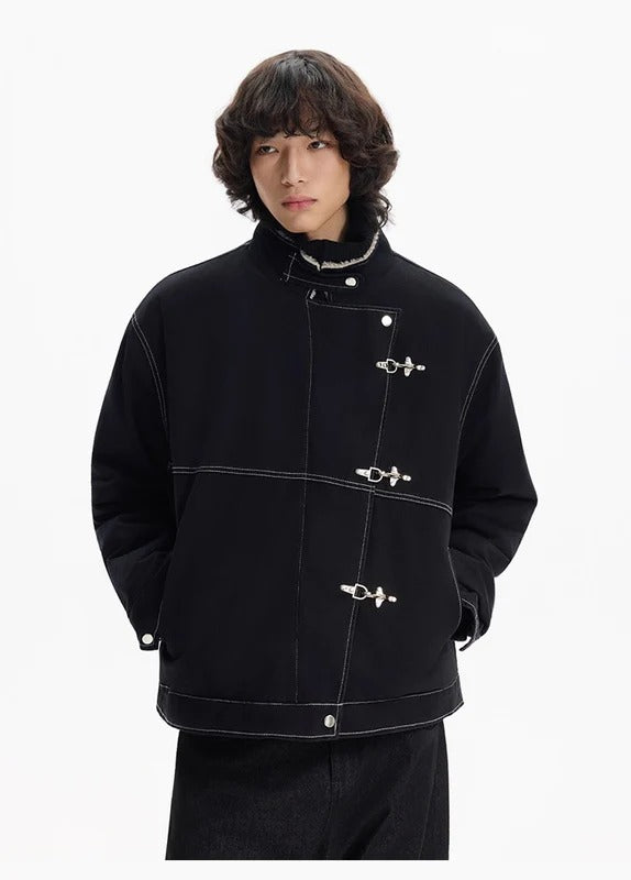 Cold streets demand heavier energy. Plush shearling lining seals in heat while asymmetric double buckles...