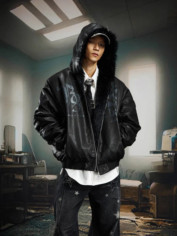 Dark gloss. Black fur framing the hood, leather-look armor on the outside—built to hold heat...