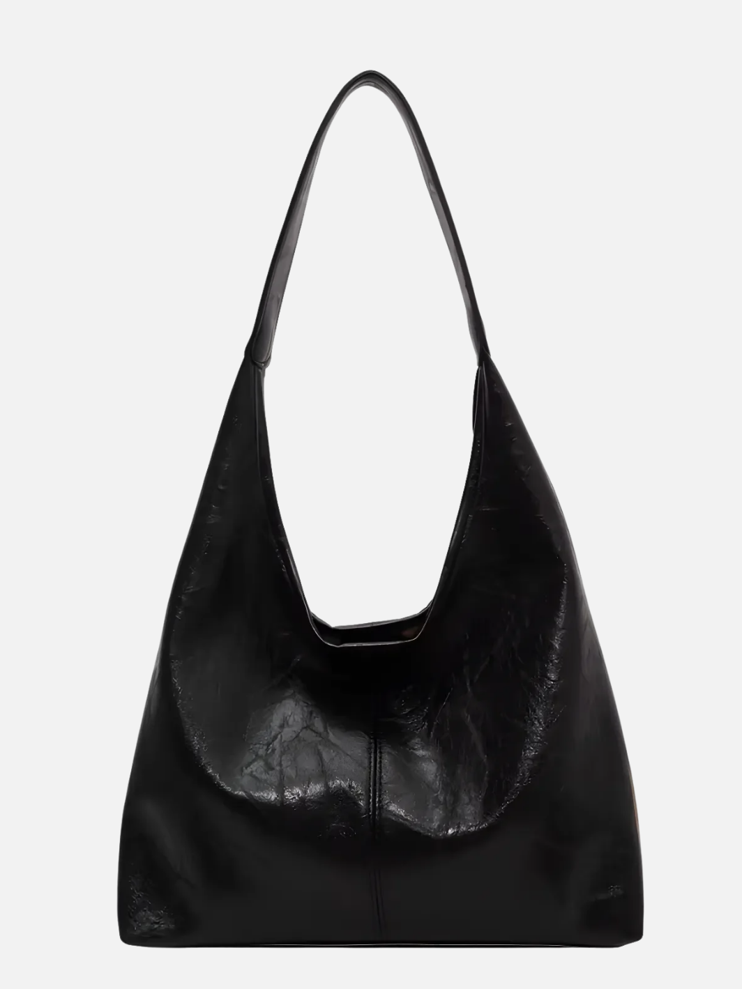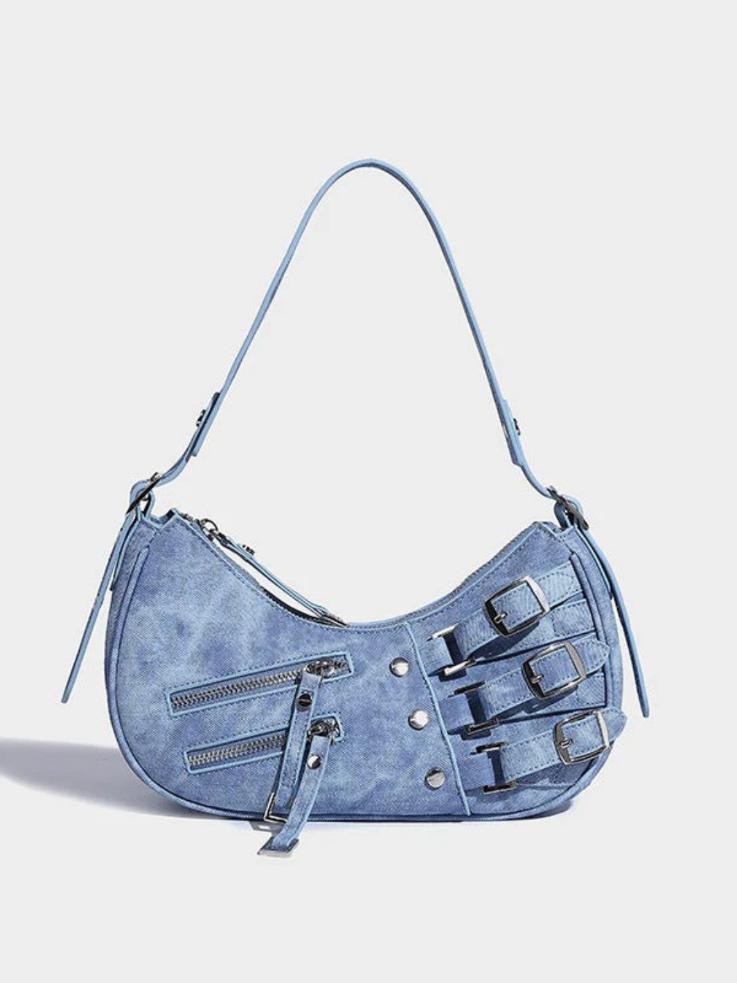Compact curve. Heavy attitude. Half-moon silhouette cut from smooth PU leather, locked down with bold...