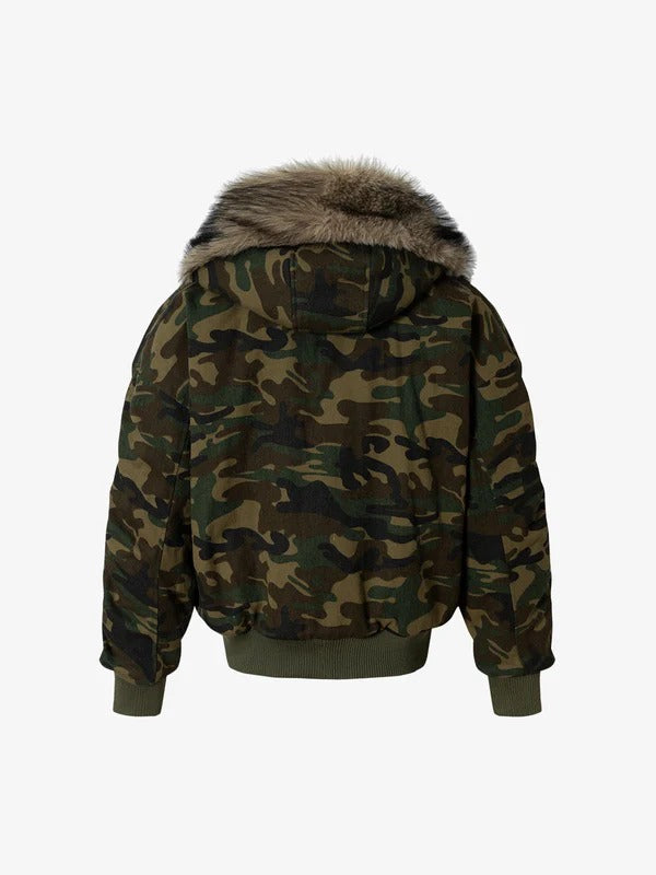 Marked territory. Vintage camo wraps a quilted bomber frame, armored with a fur-lined hood and collar that lock out the cold without softening the stance. Double-breasted closure and heavy patch pockets seal the deal—built to dominate every block you step on.